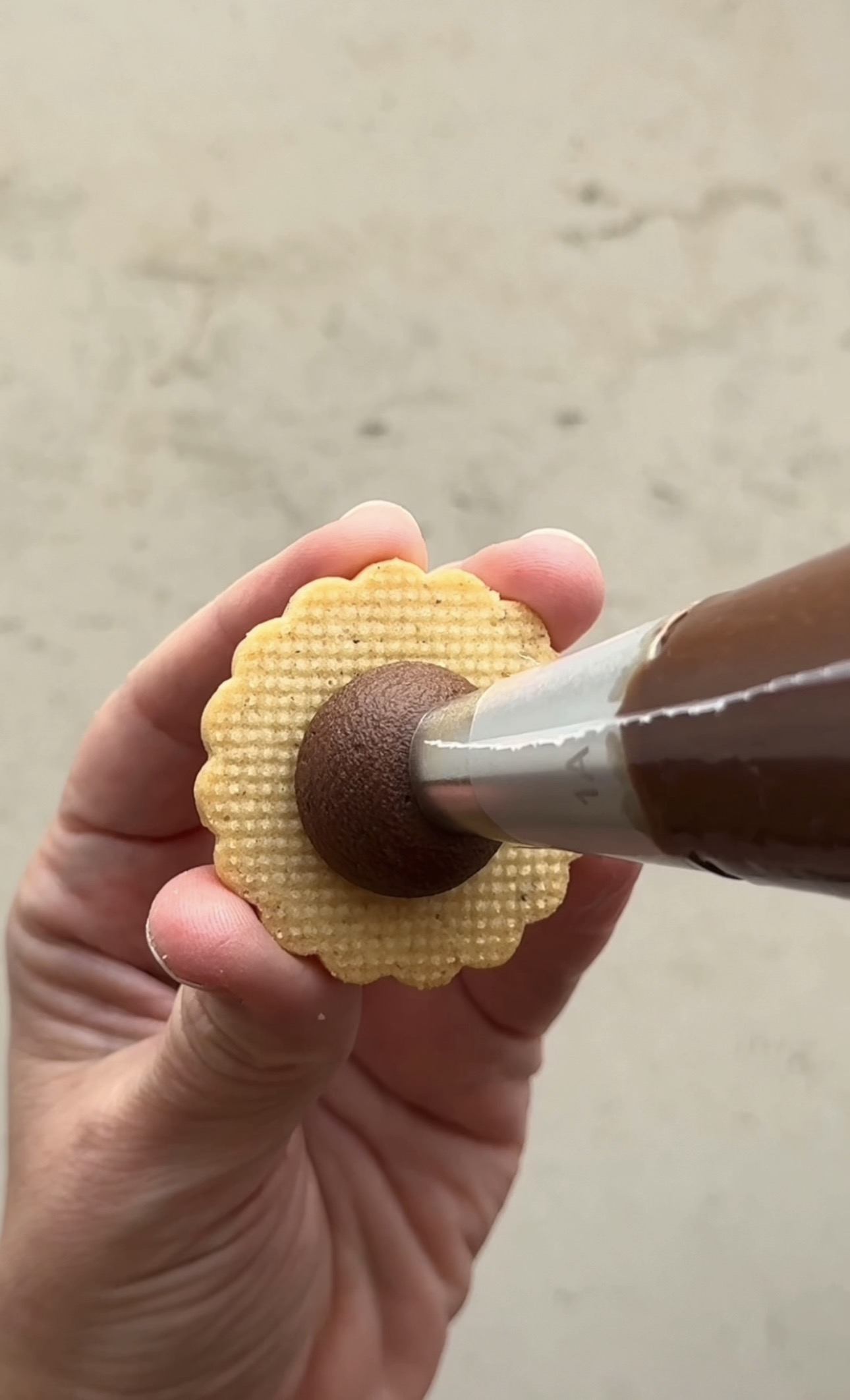 Una vez frío, lo pondremos en una manga pastelera. Cogeremos una galleta, le pondremos un poquito de relleno y cubriremos con otra galleta.